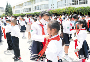 哥哥姐姐们帮新入队的一年级学生佩戴红领巾。 记者杨艳辉摄