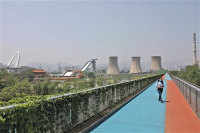 在首钢园北区群明湖北侧,一座三层“空中步道”被绿植环绕,已初具规模。站在顶层四望,周边被首钢工业老厂房环绕,向南远眺可以看到新首钢大桥,和背靠三座冷却塔的滑雪大跳台。据项目负责人介绍,这条步道由工业管廊改造而成,最高处约12米,待整体建成后将分段开放。