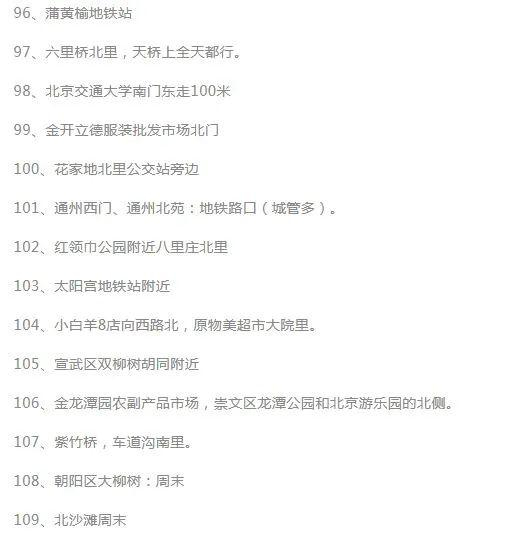 大部分文章中列出了108个北京市的点位,有的还有109个,涉及朝阳、东城、西城、海淀、通州等多个区。有的在小区门口,有的在天桥附近,还有的在地铁周边。