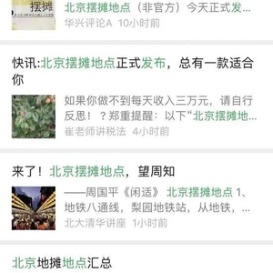 近日,微信朋友圈一则名为“北京摆摊地点正式公布,一起去摆摊吧”的文章迅速流传,类似文章也层出不穷。