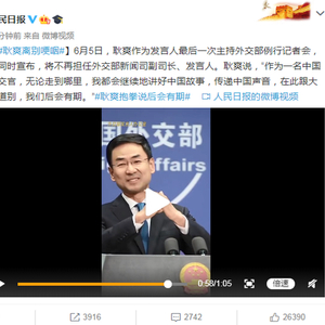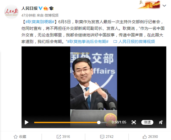 6月5日,耿爽作为发言人最后一次主持外交部例行记者会,他同时宣布,将不再担任外交部新闻司副司长、发言人。耿爽说,“作为一名中国外交官,无论走到哪里,我都会继续地讲好中国故事,传递中国声音,在此跟大家道别,我们后会有期。”