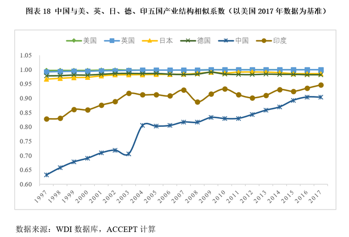 和发达国家相比,中国的产业结构还有较大的调整空间。改革开放以来,中国的产业结构经历了较大的调整:农业在国内生产总值中的份额持续下降,由1978年27.7%,持续下降至2019年的7.1%,下降了20个百分点;与此同时,服务业呈现快速发展趋势,在GDP中所占的份额由1978年的24.6%上升至2019年的53.9%。为比较中国和主要发达国家的产业结构,我们根据联合国工业发展组织(UNIDO)所提出的“产业结构相似系数”,分别计算了1997-2017年中、美、英、日、德、印六个国家的系数,并统一选取美国2017年为基准。不难发现,传统发达国家产业结构高度相似,和这些国家相比,中印等发展中国家产业结构还有较大的调整空间。
