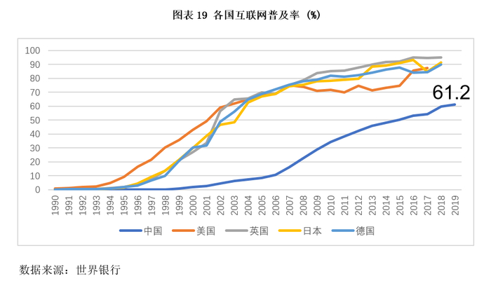 中国的信息化已初具规模,但仍有待深入。经过近30年的长足发展,中国的信息化目前已初具规模。截至2019年6月,中国网民规模已达8.54亿,约为美国网民数量的2.9倍,互联网普及率超过六成,达到61.2%。但是,我们也应清楚地看到,相较于主要发达国家普遍高于80%的互联网普及率(美国87.3%、英国94.9%、日本91.3%、德国89.7%),中国的信息化普及仍有进一步提升空间。
