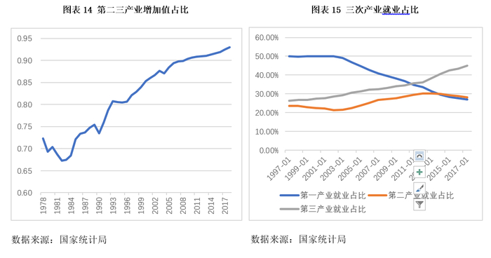 从就业比例结构来看,中国的工业化水平明显不足。2018年,非农产业就业人口占总就业人口的比重仅为74%。不仅远远低于发达国家95%以上的水平,甚至低于巴西、墨西哥等发展中国家的水平。作为参考,2018年欧洲国家平均的第二三产业就业人口占比达到96%,日本为97%,美国为98%,巴西为90%,墨西哥为87%。未来十五年左右的时间里,逐步推进由工业化中后期向后工业化经济的转变、实现高质量的工业化将是中国经济发展的一个主要任务,非农产业就业人口占比会进一步上升,农业就业人口将显著减少。