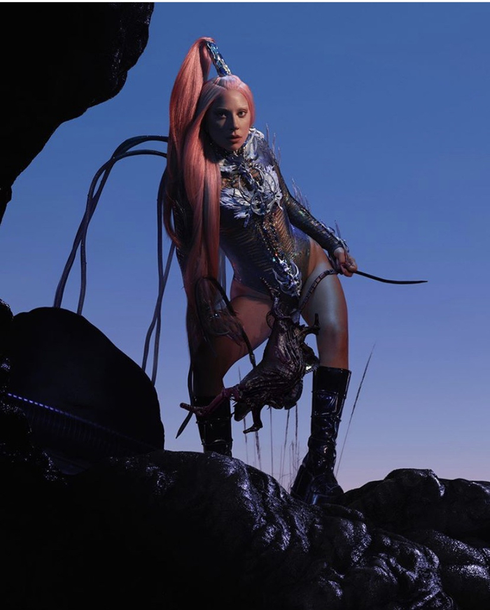 在此前Lady Gaga为外媒拍摄的专辑宣传写真中,她同样造型大胆,画面随处彰显着赛博朋克风格和未来主义风格,与《Chromatica》秉承的视觉语言体系一脉相承。写真中机械的元素反映了数字时代人们逐渐缺失的真实,而环绕Gaga身体的相机则警示了当下媒体对隐私权的侵犯。