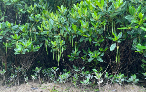 由秋茄种子发育而成的胚胎,长得像迷你的茄子挂在树梢,它们掉到滩涂上就能生根发芽,长成一棵新的树。