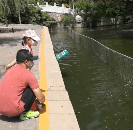 6月3日下午,记者在紫竹院公园南门附近水域看到,有个小女孩将一个不小的网兜插入水中,想从水里捞出小鱼,尝试了几次都没有成功。见此情景,站在身旁的妈妈并未加以制止。