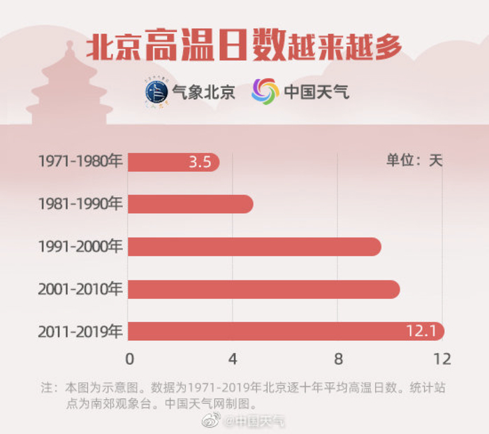 1971年以来,北京的高温日数上升趋势尤为明显,上世纪七十年代,北京的年均高温日数为3.5天,八十年代上升到4.8天,九十年代达9.7天,进入21世纪,年均高温日数均超过10天,2011年至2019年的年均日数更是高达12.1天。