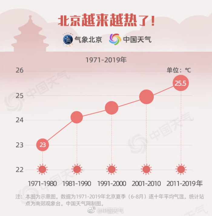 中国天气网和北京市气象局数据显示,北京夏天呈现越来越热的趋势,高温日数增多,整个夏季(6-8月)的平均气温也一路走高。