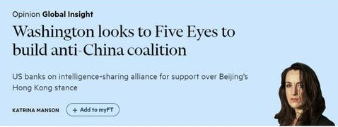 近日,《金融时报》发表文章,题为《美国指望五眼国家建立反华联盟》。