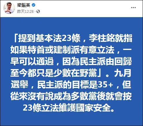 至于“提到《基本法》23条,李柱铭就称如果特首或建制派有意立法,一早可以通过,因为所谓的‘民主派’从回归至今都只是少数在野党”,梁振英也摆出了“打脸”证据:“九月选举,民主派的目标是35+,但从来没有说成为多数党后就会按23条立法维护国家安全。”