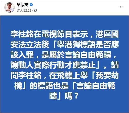 6月7日,香港前特首梁振英也在社交媒体上驳斥、质问道,李柱铭在电视节目上宣称,“港版国安法”立法后,“举‘港独’标语是否应该入罪,属于言论自由范畴,煽动人实际行动才应禁止”。“请问李柱铭,在飞机上举‘我要劫机’的标语也是‘言论自由范畴’吗?”