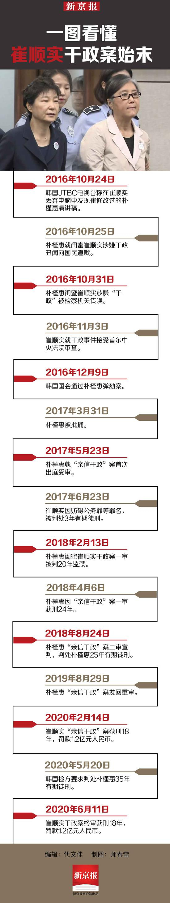 6月11日,韩国最高法院对崔顺实干政案作出终审宣判,崔顺实获刑18年,罚款200亿韩元(约合1.2亿元人民币)。爆发于2016年的韩国干政丑闻,延烧至今已过去4年,韩国前总统朴槿惠也因此遭弹劾而入狱,从青瓦台主人沦为阶下囚,闺蜜干政、政坛地震……四年来,猛料迭出,新闻不断,小编带你一图看懂韩国总统“闺蜜”干政案始末。
