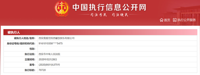6月12日,新京报记者从企查查获悉,真爱范特西已成为被执行人,其于今年2月28日被西安市中级人民法院立案,案号为(2020)陕01执375号,案件审理程序为首次执行,执行标的为70720元。此外,中国执行信息公开网同样披露了该条被执行人信息。