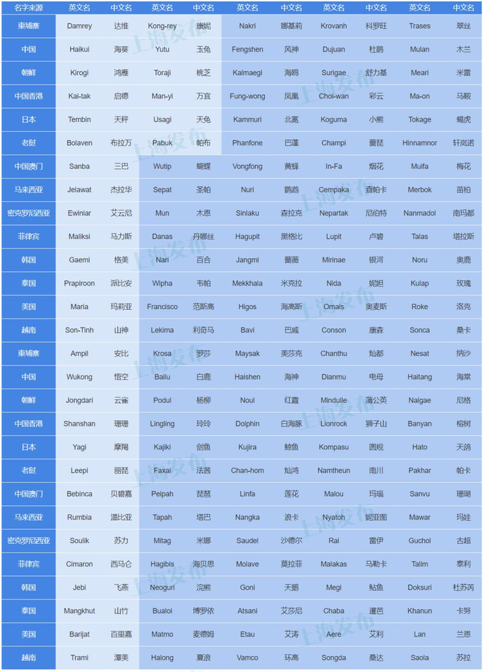 市气象局说,台风由14个国家和地区各选10个名字循环使用,部分造成恶劣灾害的台风还有可能被除名。目前,中国大陆提供的10个名字分别是海葵、玉兔、风神、杜鹃、木兰、悟空、白鹿、海神、电母、海棠。其中,“木兰”取代了被除名的“海马”,“白鹿”取代了被除名的“海燕”。