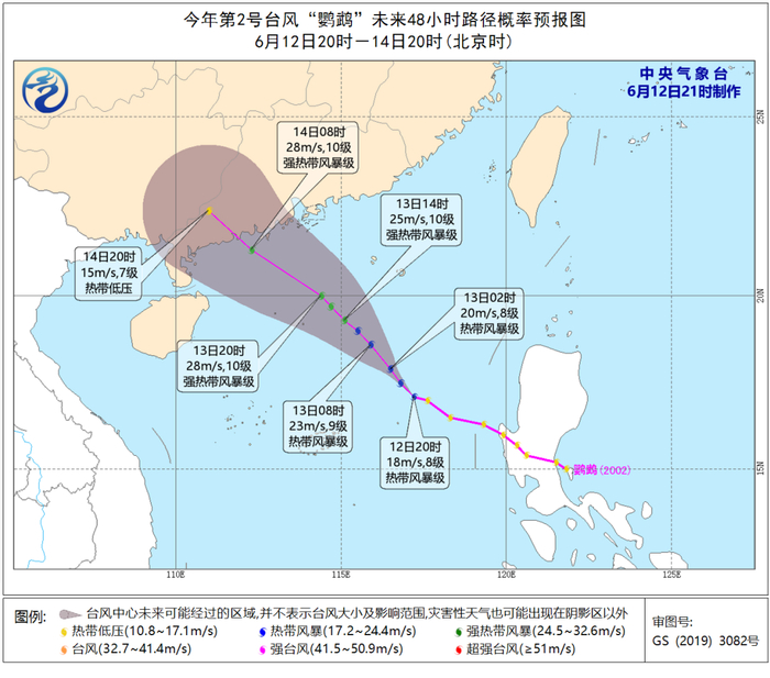 中央气象台刚刚宣布:南海热带低压已于今天(12日)晚上加强为今年第2号台风(热带风暴级;英文名称:Nuri;中文名称:鹦鹉;名字来源:马来西亚;名称意义:一种蓝色冠羽的鹦鹉),20时其中心位于广东省阳江市东南方约760公里,北纬17.1度、东经117.2度,8级(18米/秒),998百帕。预计,“鹦鹉”将以每小时15-20公里的速度向西北方向移动,强度逐渐加强,预计14日中午前后在广东深圳到徐闻一带沿海登陆(23-28米/秒,热带风暴级或强热带风暴级)。