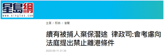 [环球网报道 记者 尹艳辉]香港自“修例风波”至今,约2000人被起诉,在涉港国安立法决定公布后,有被捕者被曝弃保潜逃,令人关注疑犯趁保释期潜逃离港逃避刑责问题。香港《星岛日报》《文汇报》等港媒报道,香港律政司发言人11日表示,基于近期有被告人潜逃,律政司会慎重考虑在日后处理申请保释的聆讯时,向法庭提出禁止被告人离开香港的条件,也不排除向法庭申请复核已获保释的被告人的条件。