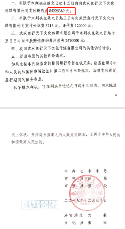 2019年12月30日,湖北省高级人民法院对主播韦朕合约期内跳槽案件作出判决,判定韦朕(直播名:韦神)在合同期内跳槽其他平台的行为为故意根本违约,按照合同约定,判决韦朕向原告武汉鱼行天下文化传媒有限公司(以下简称:鱼行公司)支付违约金8522万元。