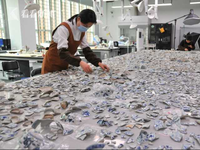 瓷器碎片的拼对,没有特别的窍门,考验的是修复人员的耐心和细心。首先对碎片按照窑口、釉色、纹饰、胎色、尺寸、部位等对进行分类,然后由修复师一片一片按照上述分类特征及碎片茬口进行比对、拼合,完成无数个没有标准参照的拼图。