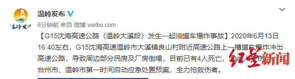 据温岭发布消息显示,6月13日16:40左右,G15沈海高速温岭市大溪镇良山村附近高速公路上一槽罐车爆炸冲出高速公路,导致周边部分民房及厂房倒塌,目前已有4人死亡,50余人受伤。