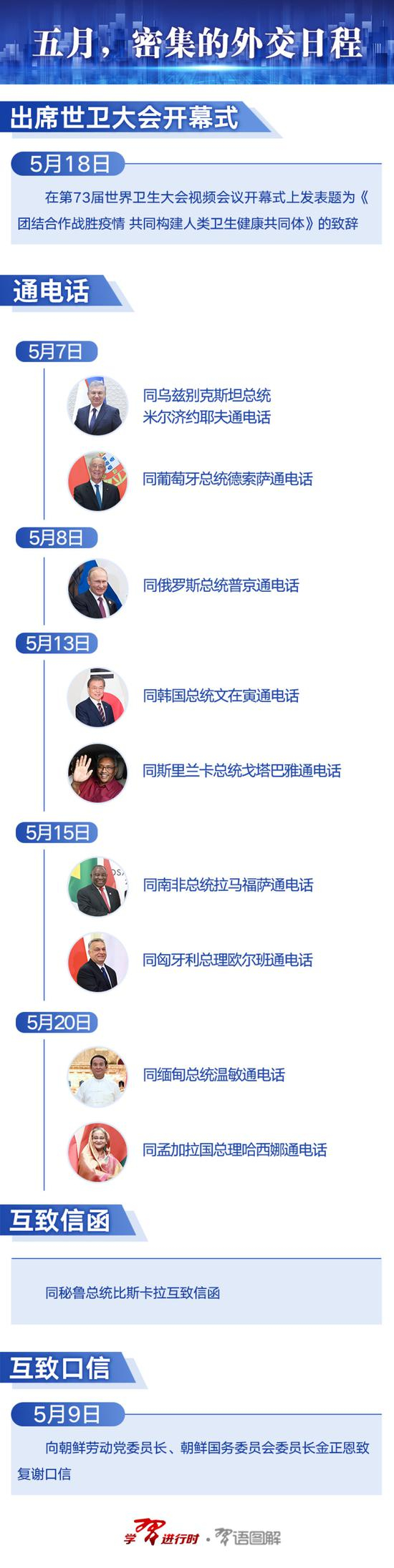 公共卫生危机是人类面临的共同挑战,团结合作是最有力武器。五月,习近平同乌兹别克斯坦、葡萄牙、俄罗斯等外国领导人通电、互致信函等,携手推进抗疫合作。五月中旬,习近平在第73届世界卫生大会视频会议开幕式上发表致辞,直面全球抗疫的一系列紧迫和长远问题,从构建人类卫生健康共同体的高度,提出建议和举措,为国际社会团结合作战胜疫情指明了方向。