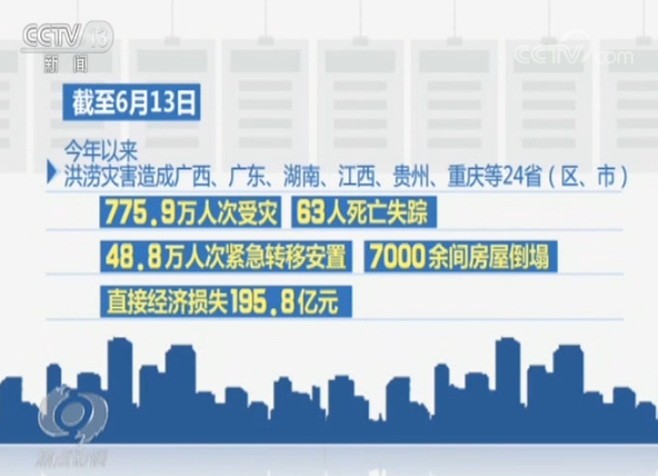 入汛以来,应急管理部组织消防救援队伍累计参加抗洪抢险救援1489余起,出动指战员2万余人次,营救和疏散转移遇险群众21920人。截至6月13日,今年以来洪涝灾害造成广西、广东、湖南、江西、贵州、重庆等24省(区、市)775.9万人次受灾,63人死亡失踪,48.8万人次紧急转移安置,7000余间房屋倒塌,直接经济损失195.8亿元。在受洪水影响较重的地区,受困群众的安置是地方政府最重要的工作之一。