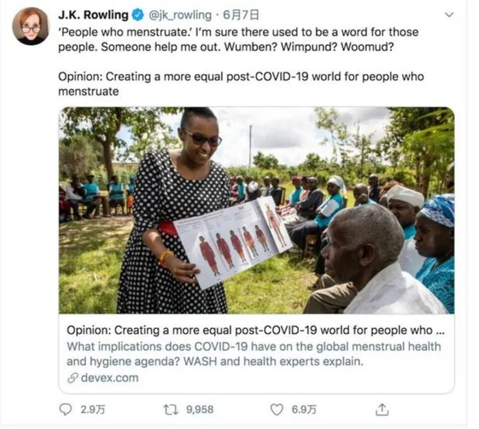 陷入了发表“歧视跨性别者”言论的风波。6月7日,罗琳在推特上转发了一篇美国新闻网站devex上的评论文章。该文将“女性”替换成了“来月经的人”,以示对LGBT群体的尊重。罗琳随即发推讽刺了这种提法,认为它会取消生理性别的差异。