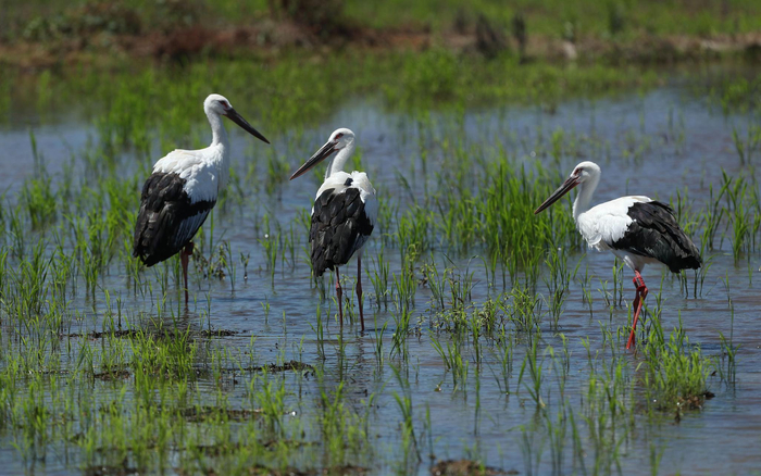 3只东方白鹳幼鸟在水边嬉戏。江西省林业局供图