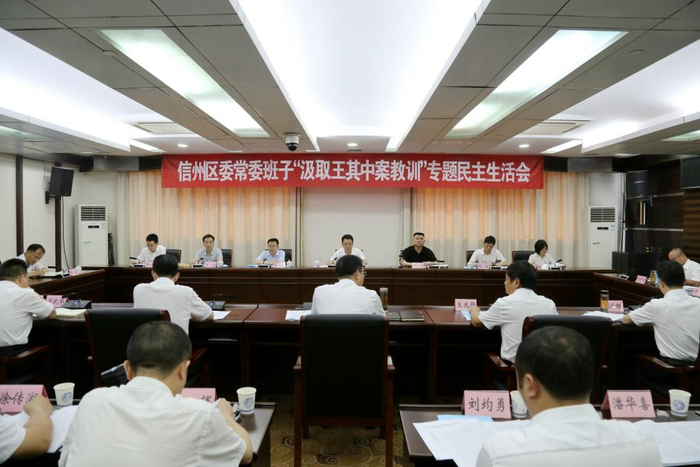 此次警示教育大会是省纪委省监委运用王其中严重违纪违法案件开展警示教育活动的内容之一。6月11日下午,在省纪委省监委和上饶市纪委市监委的指导下,信州区委领导班子专门召开“汲取王其中案教训”专题民主生活会,班子成员认真对照案件暴露出来的突出问题和党章党规党纪,联系班子和个人实际,深入对照检查,严肃认真开展批评和自我批评,起到了红脸出汗的效果。王爱东同志出席并讲话。