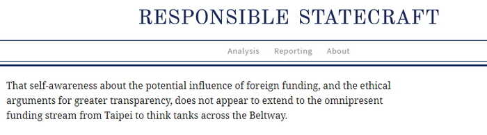 近日,美国智库“昆西国家事务研究所”(Quincy Institute for Responsible Statecraft)刊登了一篇文章,披露说美国有多家高级政策类智库在过去几年里一直在从台湾当局设置在美国的“台北经济文化代表处”拿取台湾当局的金钱赞助,并撰写为台湾当局说话,呼吁美国政府支持台湾当局的文章和报告。
