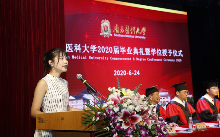 在校生代表、2018级中医学专业(名老中医传承班)李星金在发言中回忆起与师兄师姐在校相处的点滴,道出了心中的不舍:“清晨的春华堂回荡朗朗书声,夜晚的生命科学楼实验室里灯光长明,碧窗红瓦的教学馆,见证你们的成长蜕变;明亮宽敞的高层公寓,回荡着你们的欢声笑语;温柔恬静的景湖,倾听着你们的青春故事。”“谢谢你们对我们的关心、爱护,因为有你们的指引,我们少走了许多弯路,我们的大学回忆也因为有你们的帮助而变得弥足珍贵,我们也定将这份南医情传承下去。”