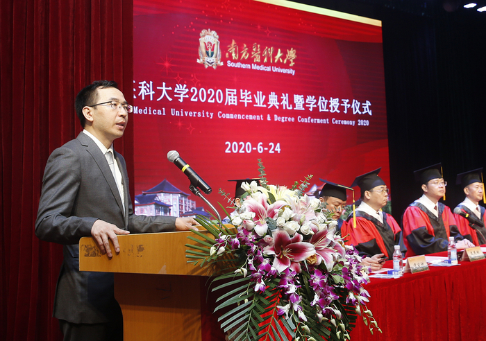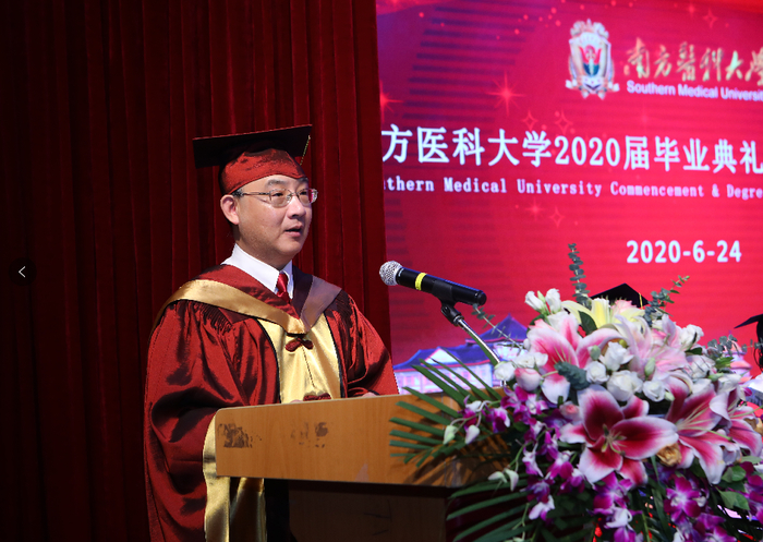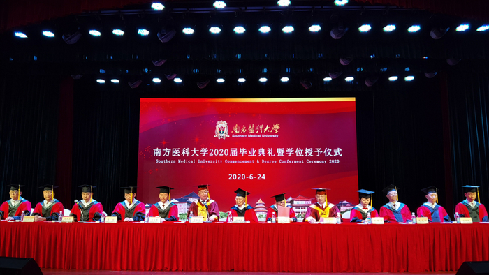 24日上午,南方医科大学2020届毕业典礼在校本部国际会议厅庄重举行。毕业典礼通过学习强国等平台在网络进行直播。4141名毕业生分别在国际会议厅主会场和网络上与校领导、两院院士、校友代表,机关处室、学院负责人,专家教授及教师代表共同见证这一特别却值得铭记的“云端”毕业典礼。典礼由党委书记陈敏生主持,校长黎孟枫致辞,全体校领导出席。