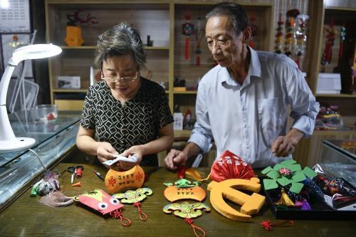 郑莺莺和丈夫姚明石在制作香囊。受访者供图