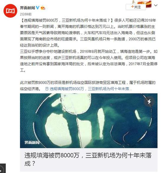 近日,三亚新机场项目两公司因违规填海造地,被处以8000万罚款。