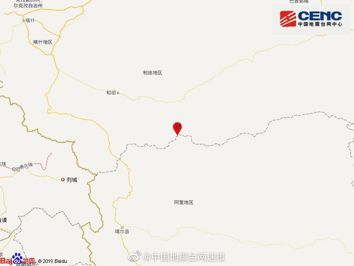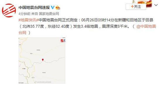 新疆和田地区于田县发生3.4级地震 震源深度8千米