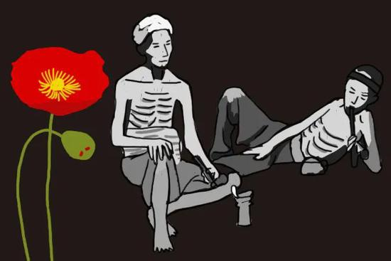 生鸦片:褐色或黑色块状,外脆内粘有陈旧的尿味,味苦。