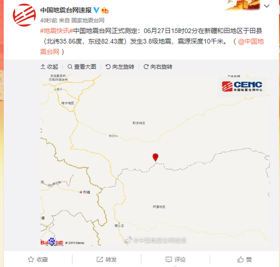中国地震台网正式测定:06月27日15时02分在新疆和田地区于田县(北纬35.86度,东经82.43度)发生3.8级地震,震源深度10千米。