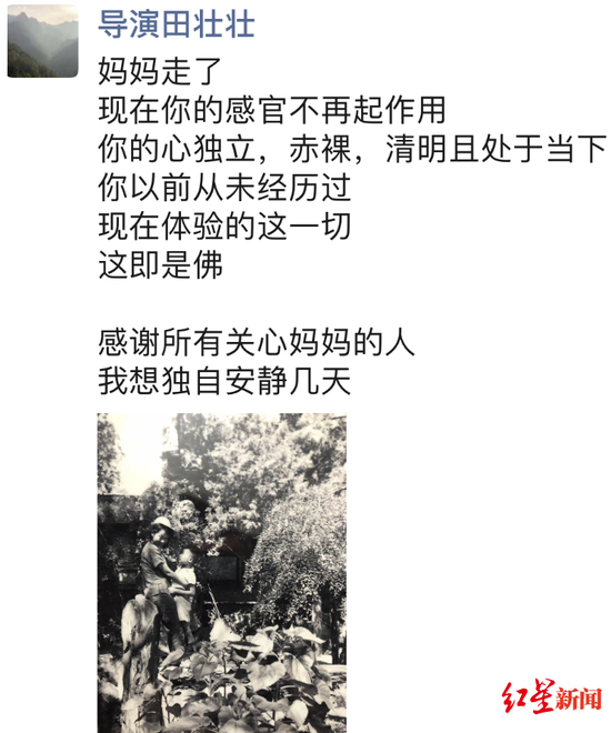 田壮壮在朋友圈写道:“妈妈走了,现在你的感官不再起作用,你的心独立、赤裸、清明且处于当下,你以前从未经历过现在体验的这一切,这即是佛。”他还表示,“感谢所有关心妈妈的人,我想独自安静几天。”