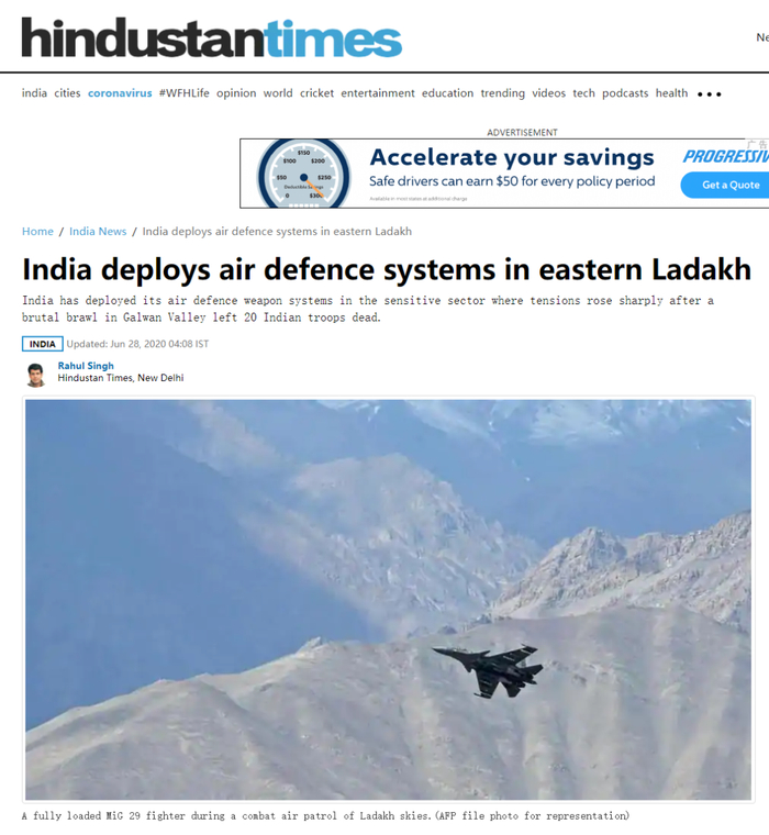 [环球网报道 记者 徐璐明]据《印度斯坦时报》6月28日报道,中印边防部队在加勒万河谷地区发生冲突后,印度已经在拉达克地区东部部署了防空武器系统。