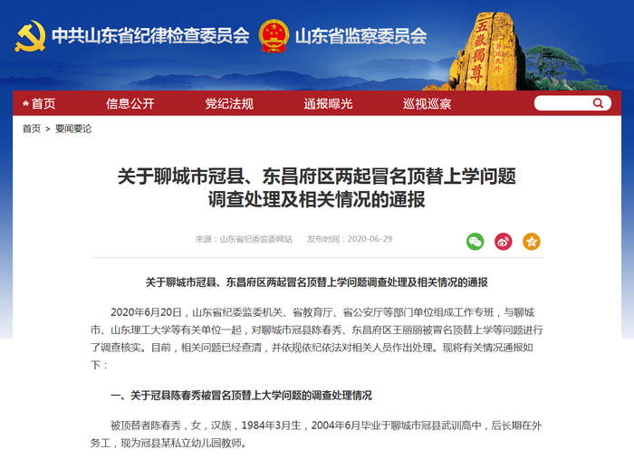 6月29日深夜,山东省纪委监委网站发布消息,通报了该省聊城市冠县、东昌府区两起冒名顶替上学问题调查处理及相关情况,共问责46人。这份46人名单,是山东省纪委监委机关、省教育厅、省公安厅等部门单位组成的工作专班,历时十天的调查成果。