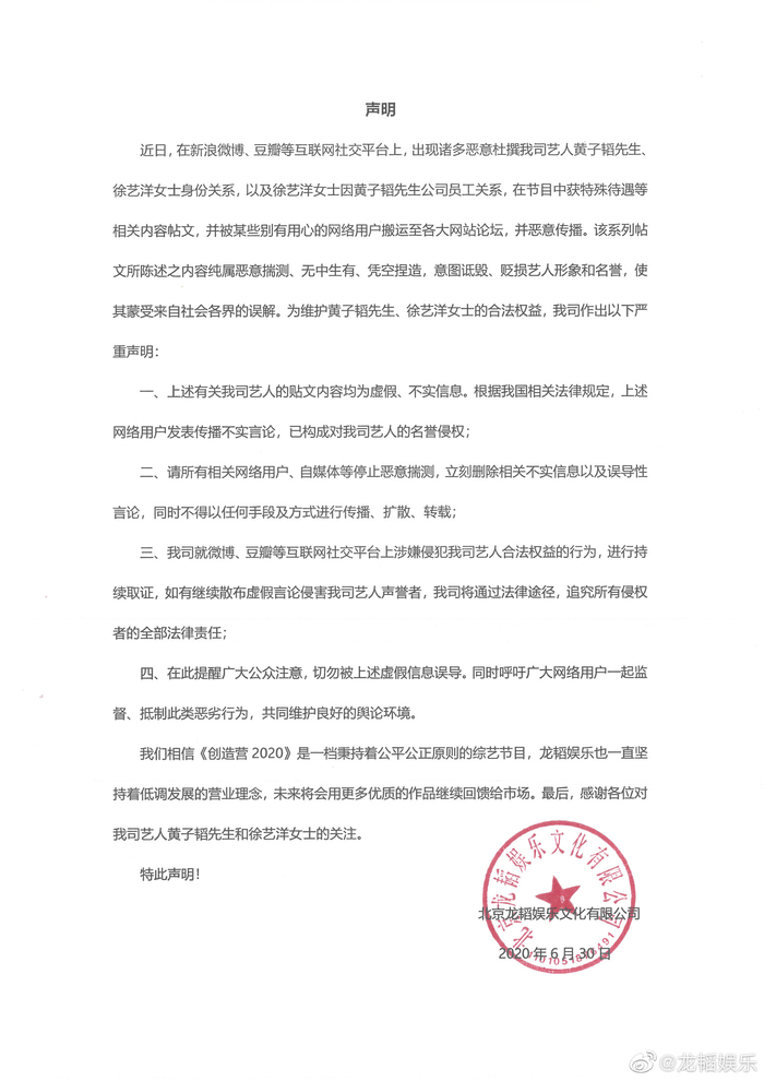 新京报讯 6月30日,黄子韬所属公司龙韬娱乐在社交媒体上发布声明,文中称,社交平台上出现诸多恶意杜撰黄子韬与徐艺洋身份关系,以及徐艺洋因黄子韬公司员工关系,在《创造营2020》中获得特殊待遇的帖子,并被恶意传播。声明表示,帖子中所陈述的内容纯属恶意揣测、无中生有、凭空捏造,意图诋毁、贬损艺人形象和名誉。