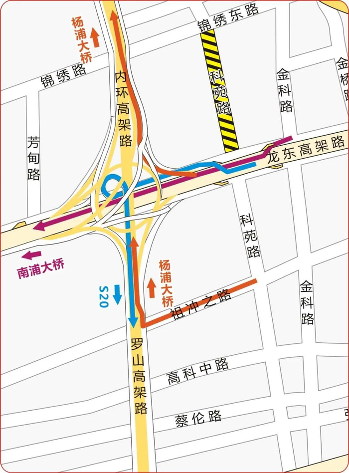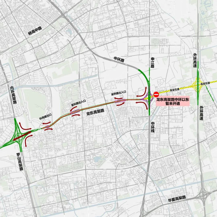 值得注意的是,此次龙东高架路主线仅开放内环高架路至中环路段,中环路以东段仍在施工。原科苑路南向西左转进入张江立交前往内环高架路南浦大桥、杨浦大桥方向的车辆,可以由新建金科路匝道或经祖冲之路往罗山路地面道路绕行。龙东高架路东向南左转罗山高架路往S20方向的车辆,需由科苑路出口匝道行驶至龙东大道地面后,经现有转向匝道通行。