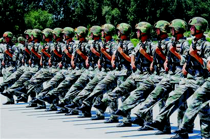 2009年国庆六十周年阅兵式上预备役方队身着07式林地迷彩作训服受阅。