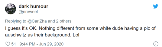 还有网友反讽称,那么白人们将纳粹统治下的奥斯维辛集中营照片设成封面也OK咯。↓