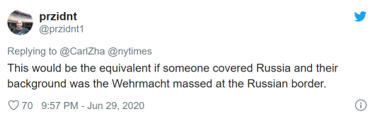 “这就相当于如果有人报道俄罗斯,他们的封面背景是集结在(前苏联)边境的德国国防军一样。”