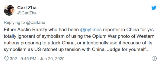 “要么是多年担任纽约时报驻华记者的奥斯汀·拉姆齐对使用西方国家准备攻击中国的鸦片战争照片的象征意义一无所知,要么就是企图加剧美国与中国的紧张局势,故意使用这张照片。你自己判断吧。”