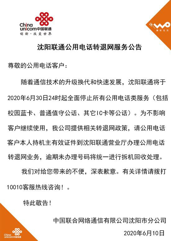 记者注意到,今年6月10日沈阳联通曾发布一则公告,称将对当地沈阳联通的公用电话实施退网。而当日发布这则“联通公用电话全面停止服务”微博的账号主体是上海一家企业。
