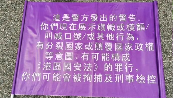 上观新闻记者在现场注意到,今天中午,部分反对派人士在铜锣湾非法集结。香港警队在现场展示紫色旗帜,上面用中英文标有“这是警方发出的警告。你们现在展示旗帜或横额/叫喊口号/或其他行为,有分裂国家或颠覆国家政权等意图,有可能构成《港区国安法》的罪行,你们可能会被拘捕及刑事检控”。