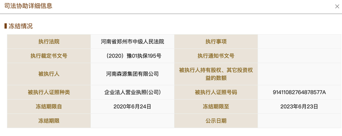 继旗下上市公司森源电气公告小额资产冻结之后,新京报记者近日获悉,河南森源集团有限公司(以下简称“森源集团”)旗下有公司出现司法冻结信息,森源集团自身也有部分财产被申请冻结。