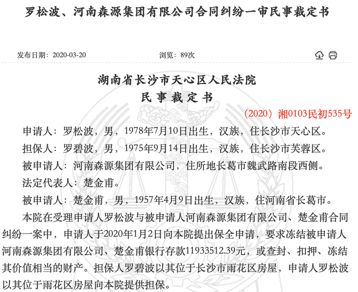 新京报记者自中国裁判文书网获悉,湖南省长沙市天心区人民法院今年早些时候作出的(2020)湘0103民初535号民事裁定,申请人罗松波向法院提出保全申请,要求冻结被申请人河南森源集团有限公司、楚金甫银行存款1193.35万元,或查封、扣押、冻结其价值相当的财产。